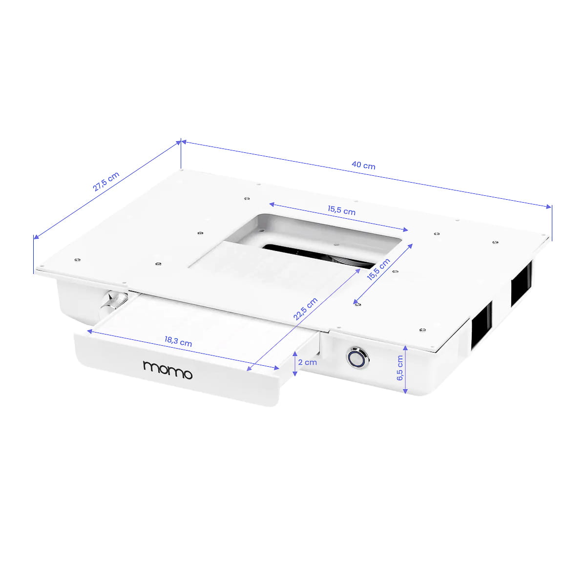 Kasetowy pochłaniacz pyłu Momo J-02 wbudowany w blat znacząco poprawia komfort i higienę pracy, skutecznie usuwając pył powstały podczas zabiegów kosmetycznych, takich jak manicure. Dzięki temu urządzeniu powietrze w salonie pozostaje czyste, a miejsce pracy wolne od zanieczyszczeń, co zwiększa bezpieczeństwo zarówno dla kosmetyczki, jak i klientów. Pochłaniacz pyłu jest łatwy w obsłudze i konserwacji, co dodatkowo podnosi jego funkcjonalność. Regularne czyszczenie oraz wymiana filtra zapewniają niezmiennie wysoką skuteczność pochłaniania. Istnieje możliwość zakupu dodatkowych filtrów wymiennych (SKU 123581). W naszym sklepie dostępny jest również filtr z aktywnym węglem (SKU 123582), który skutecznie eliminuje alergeny i drobnoustroje, podnosząc poziom higieny w salonie.
