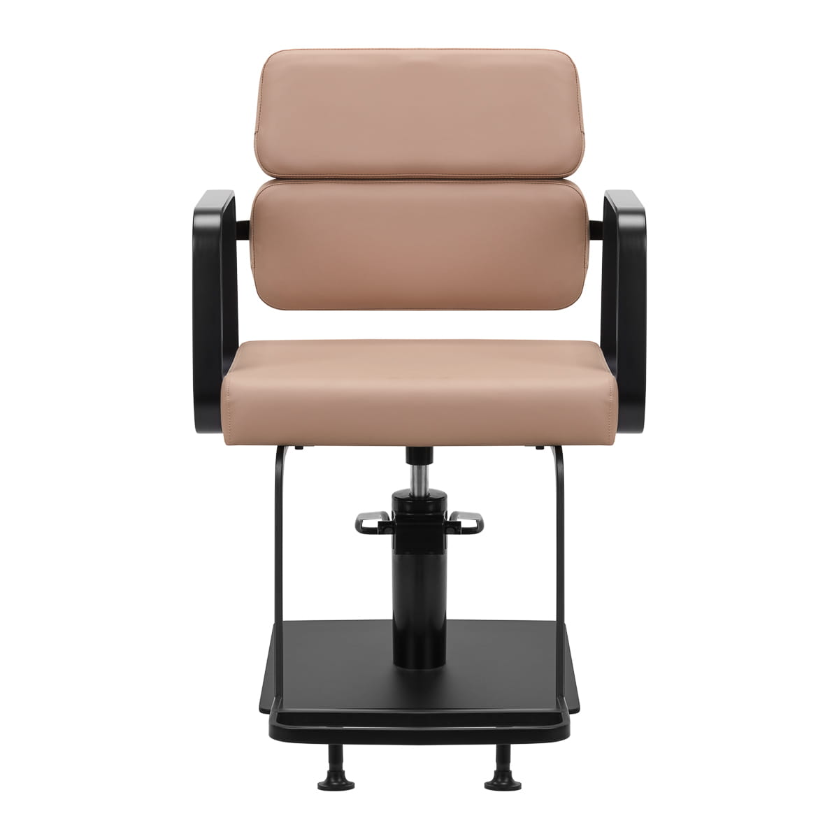 Mechanizm pełnego obrotu, w który jest wyposażony fotel, sprawia, że praca fryzjera staje się bardziej efektywna i wygodna. Solidna, płaska podstawa w kształcie kwadratu gwarantuje stabilność w trakcie użytkowania. Matowo wykończona, gładka powierzchnia nadaje elementowi elegancki wygląd i sprawia, że ten jest łatwy do utrzymania w czystości. Wygodne siedzisko z wypełnieniem z pianki zapewnia wysoki komfort użytkowania, nawet podczas wielogodzinnych zabiegów. Geometryczne, metalowe podłokietniki pozwalają na prawidłowe ułożenie barków klienta – sprawia to, że nie chowa głowy w ramionach ani się nie garbi – co wyraźnie ułatwia wykonywanie precyzyjnych zabiegów, w tym strzyżenia. Dedykowany do tego modelu stylowy podnóżek zapewnia stabilne oparcie dla stóp użytkownika.